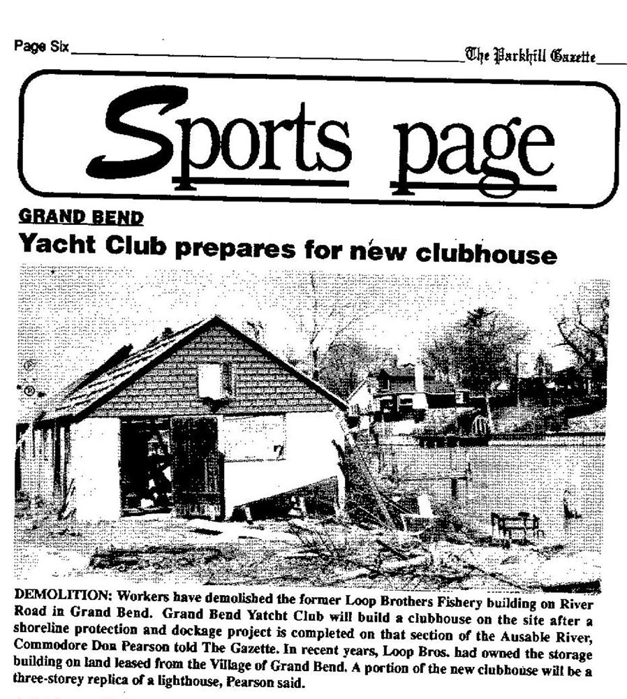 The erection of the present-day clubhouse didn’t take place until April of 1994. Loop Brothers Fishery building on River Road was demolished—they had leased the land from the Village of Grand Bend. Pictured to the left: Demolition of Loop Fisheries’ Building: